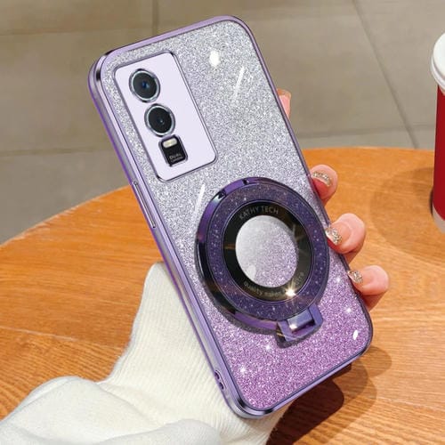 Funda para Teléfono de TPU con Soporte Redondo y Purpurina Degradada Plateada para Vivo Y76S (Morado)