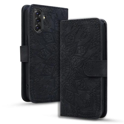 Funda de Piel de Becerro Samsung Galaxy A36 A56 Doble Pliegue Mandala En Relieve (Negra)