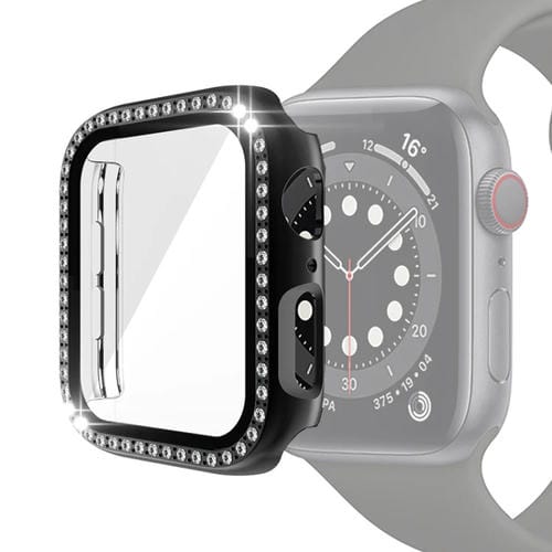 Funda Protectora Diamante 4 Hileras Galvanoplastia con Vidrio Templado para Apple Watch Series 6 SE 5 4 40mm (Negro)