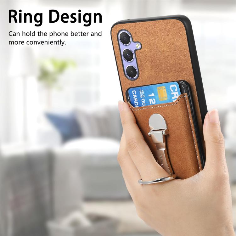 Funda retro plegable con anillo y tarjetero MagSafe para Samsung Galaxy A35 5G (marrón)