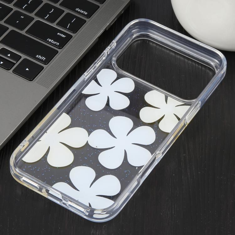 Funda transparente con diseño floral pequeño y purpurina para iPhone 17 Pro Max (Flores amarillas y azules)