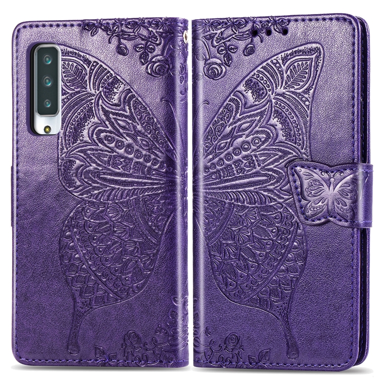 Funda de Cuero para Arrows Nx9 F-52A Butterfly Love Flower con Tapa Horizontal en Relieve, Soporte, Ranura para Tarjeta, Billetera y Cordón (Púrpura Oscuro)