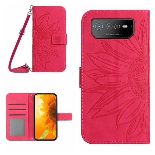 Funda Flip de Cuero para Asus Rog Phone 6 Skin Feel Sun Flower Pattern con Cordón (Rose Red)