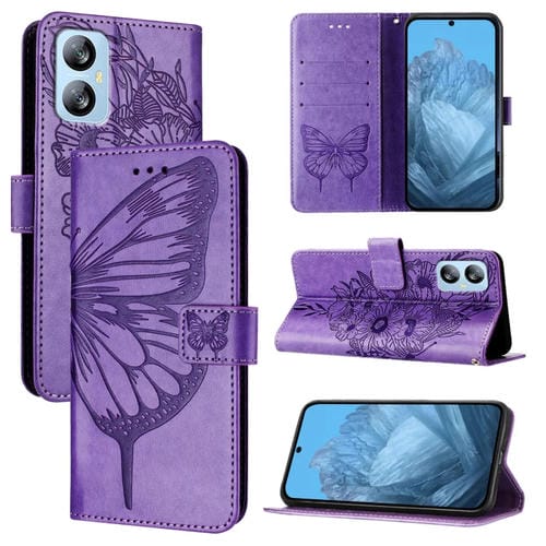 Funda de Cuero para BlackView A52 con Mariposa en Relieve (Púrpura)