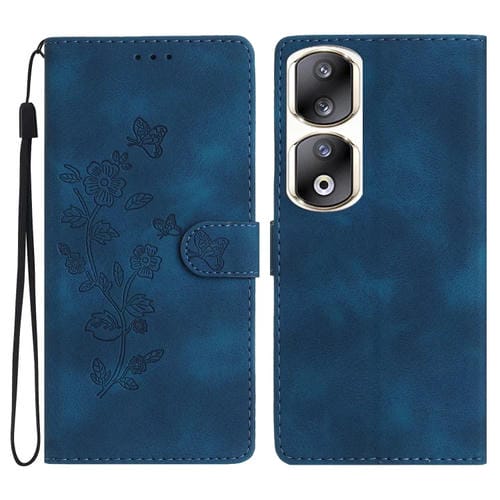 Funda de Cuero para Honor 90 Pro con Estampado de Mariposa y Flores (Azul)