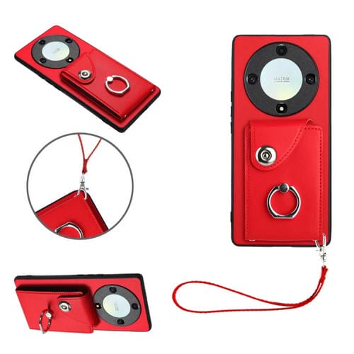 Funda para Honor X9A y Magic5 Lite de PU con Soporte de Anillo y Bolsa para Tarjeta con Cordón (Rojo)
