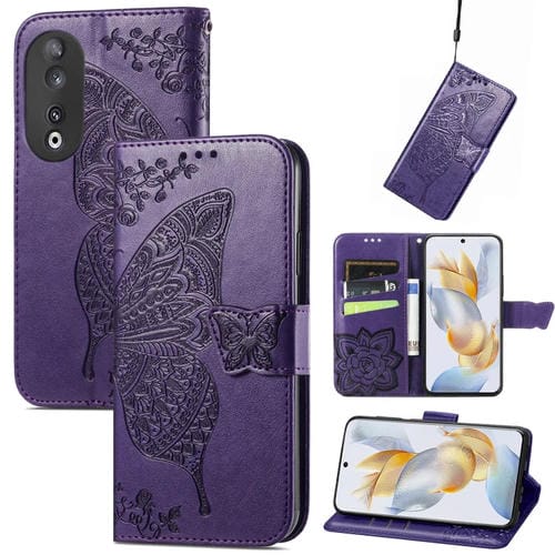 Funda para Honor X9B de Cuero con Relieve Flor de Amor y Mariposa (Púrpura)
