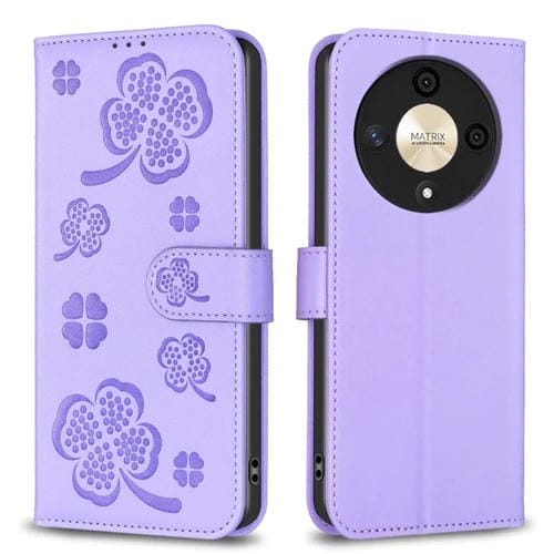 Funda de Cuero para Honor X9B y Magic6 Lite 5G con Relieve de Cuatro Hojas (Púrpura)