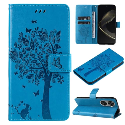 - 1x Funda para Huawei Nova 12 Se y Nova 11 Se de Cuero con Tapa y Patrón en Relieve Árbol y Gato (Azul)