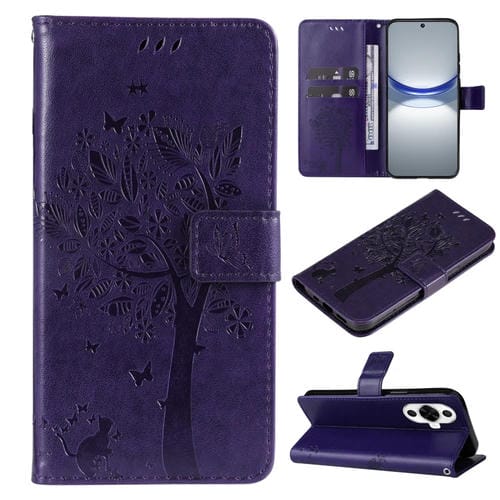 Funda para Huawei Nova 12S de Cuero con Tapa y Patrón en Relieve Árbol y Gato (Púrpura)