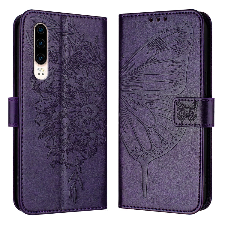Funda de Cuero Huawei P30 con Mariposa en Relieve (Púrpura Oscuro)