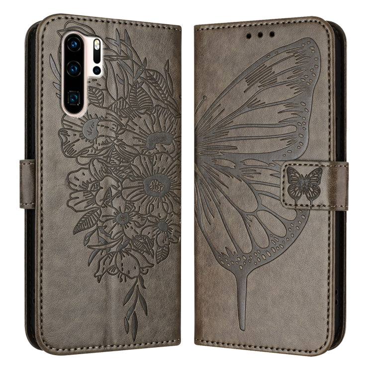 Funda de Cuero para Huawei P30 Pro con Mariposa en Relieve (Gris)