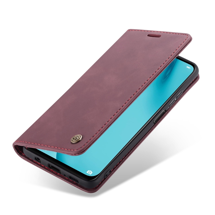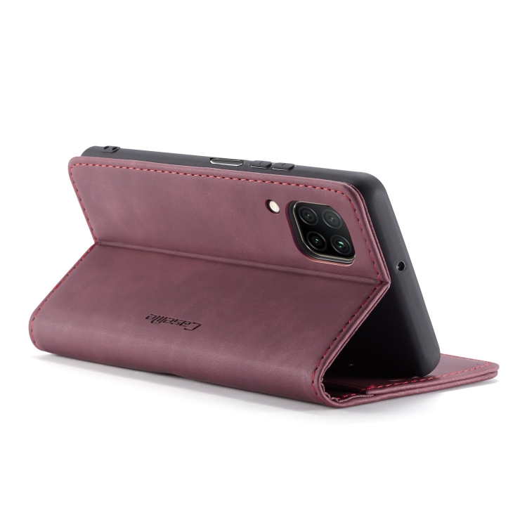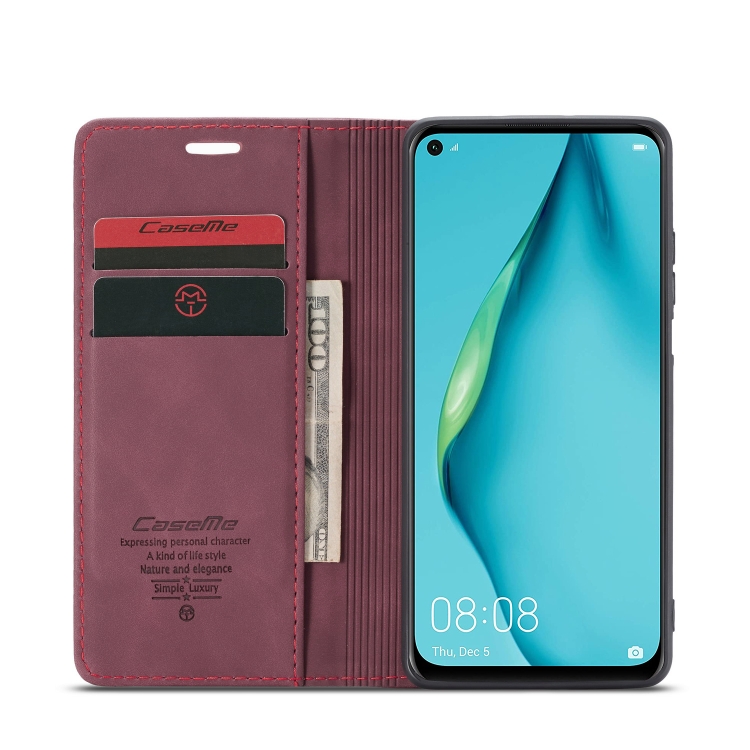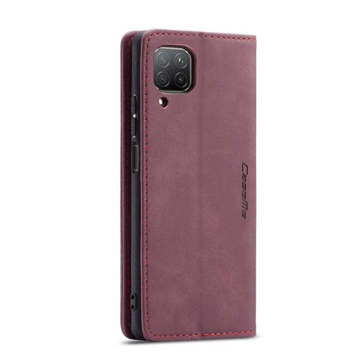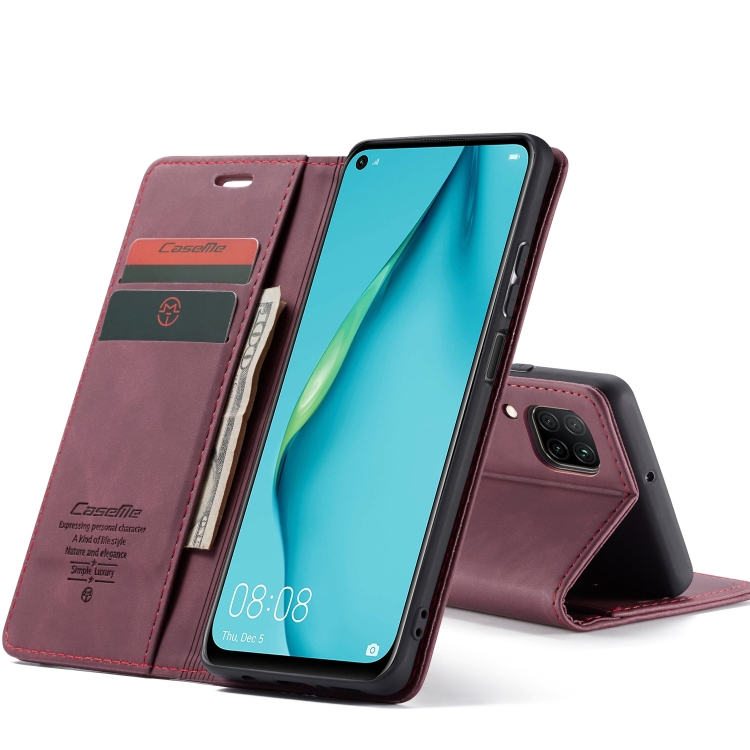 Para Huawei P40 Lite CaseMe-013 Estuche de cuero con tapa horizontal multifuncional con ranura para tarjeta, soporte y billetera (rojo vino)