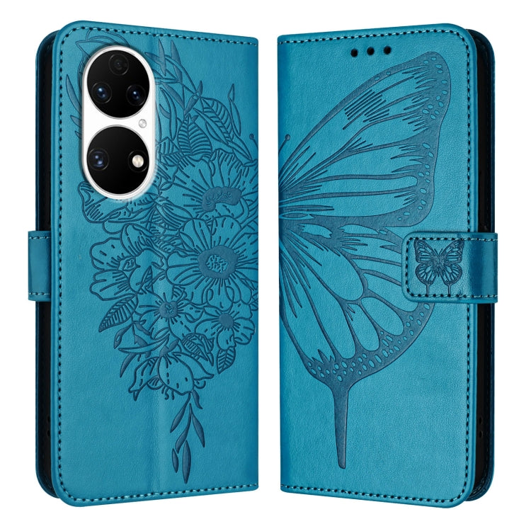 Funda de Cuero para Huawei P50 con Mariposa en Relieve (Azul)