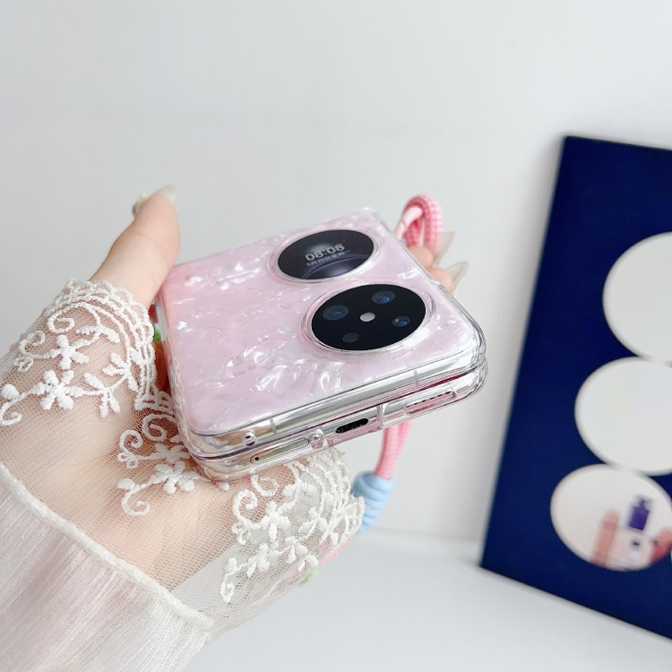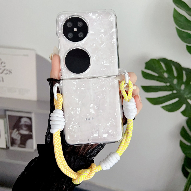 - 1x Funda para Huawei P50 con hebilla Lateral y textura de concha nacarada (Blanco) con pulsera de arcoíris
