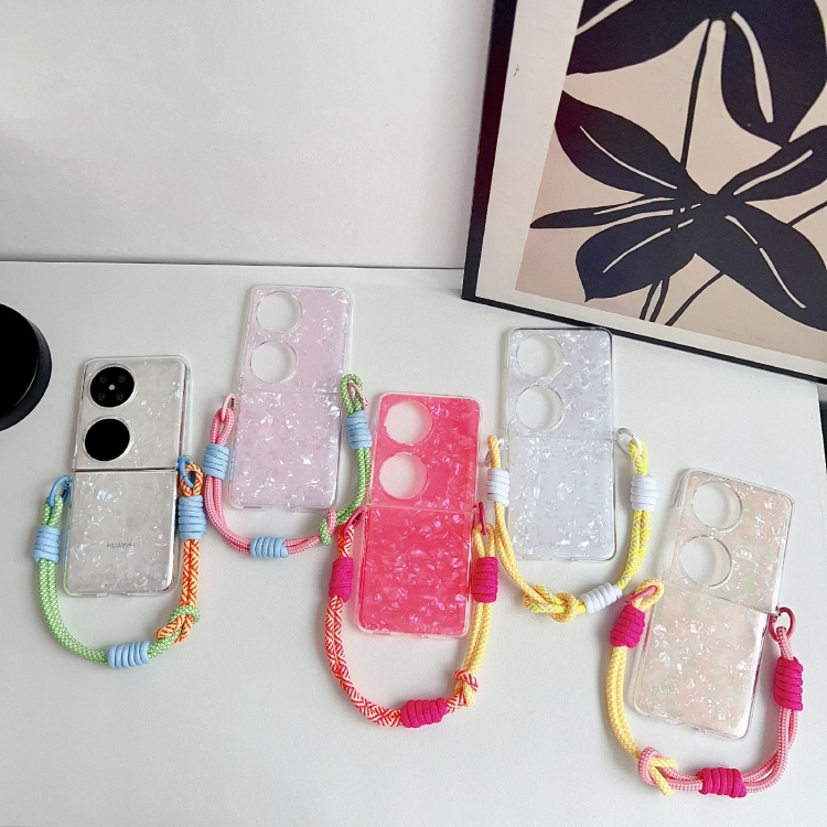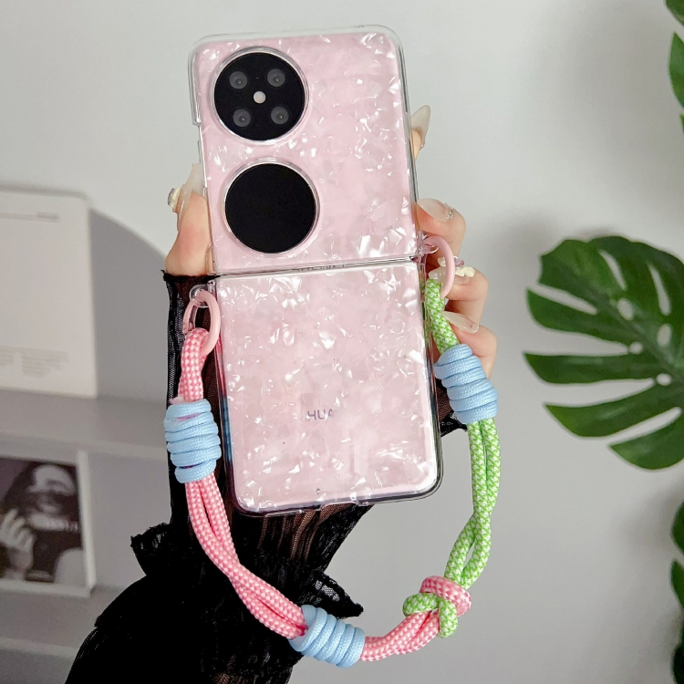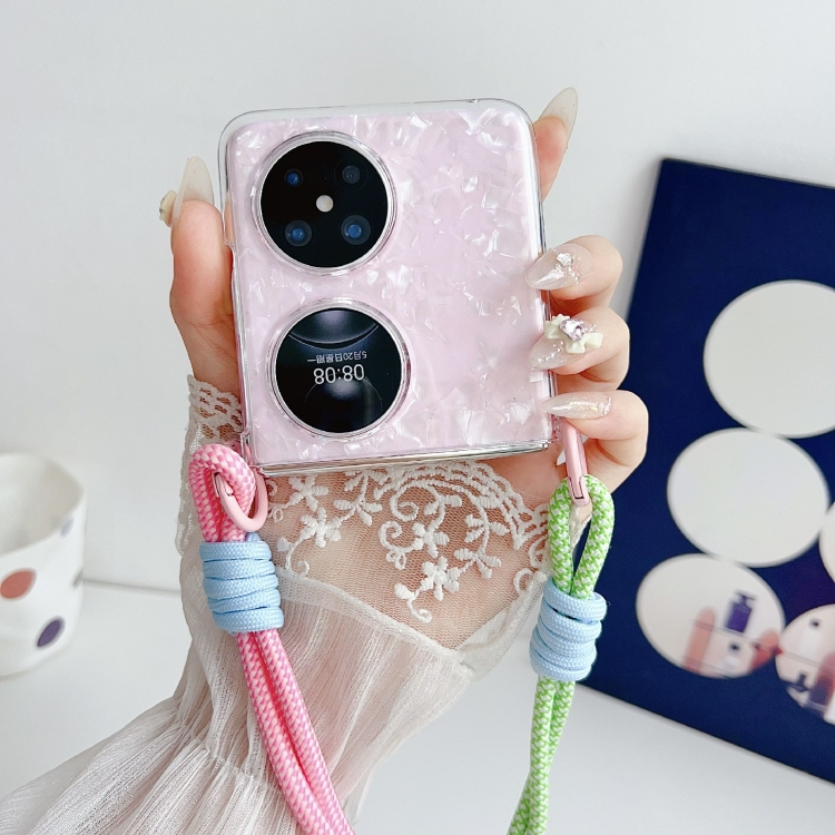 Funda para Huawei P50 con Hebilla Lateral y Textura de Concha Nacarada con Pulsera de Arcoíris (Rosa)