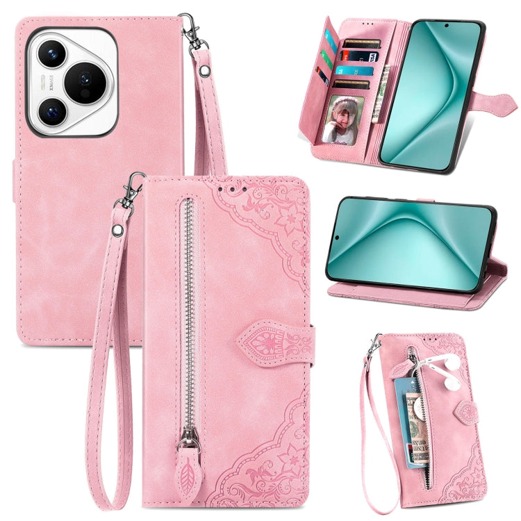 Funda de Cuero para Huawei Pura 70 con Cremallera y Flores en Relieve Ultra (Rosa)