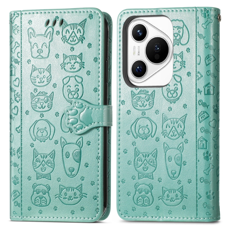 Funda para Huawei Pura 70 Pro de Cuero con Relieve de Perro y Gato (Verde)