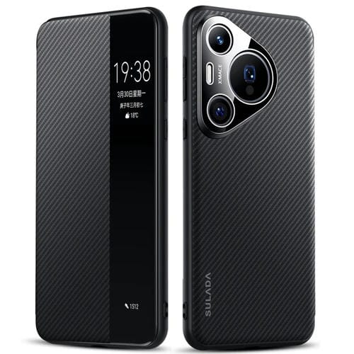 Funda de Cuero para Huawei Pura 70 Pro con Ventana Inteligente y Textura Kevlar 600D (Negro)