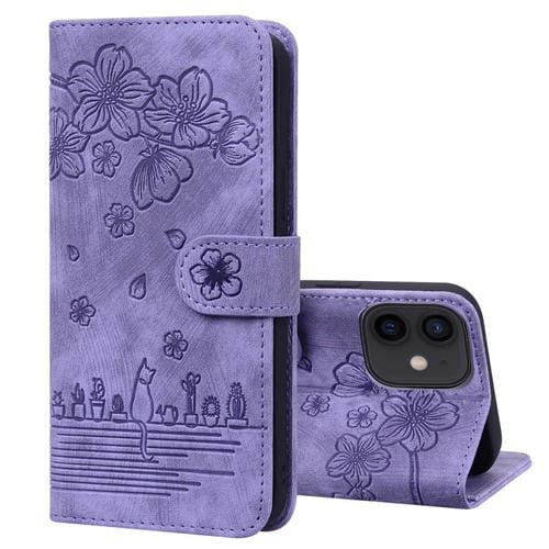 Estuche de Cuero para iPhone 11 Cartoon Sakura Cat En Relieve (Púrpura)