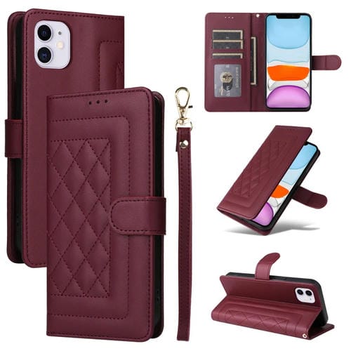 Funda para Teléfono iPhone 11 con Tapa de Cuero Diamond Lattice (Rojo Vino)