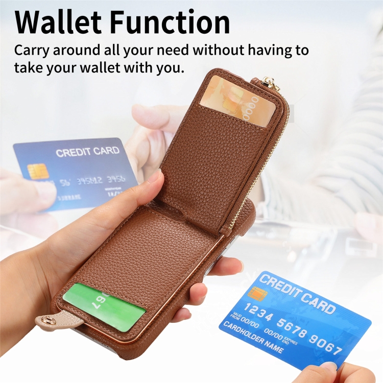 Funda Trasera para iPhone 11 con Billetera, Cremallera y Anillo de Cuero Litchi (Marrón)