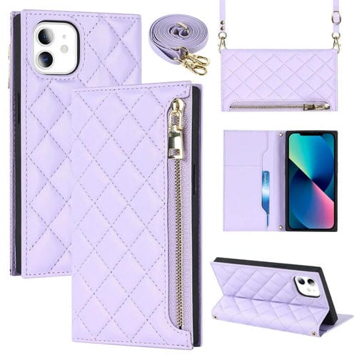 Funda de cuero para iPhone 11 con cremallera y lanyard grid texture (Púrpura)
