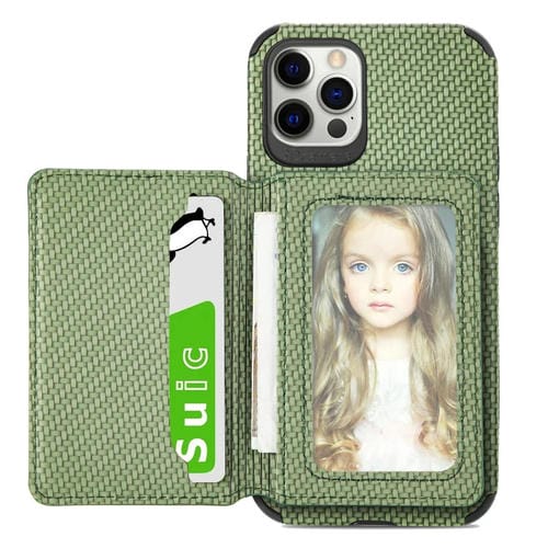 Funda Trasera para iPhone 11 Pro Fibra de Carbono TPU + PU con Bolsa de Tarjeta Magnética, Soporte, Ranura y Marco de Fotos (Verde)