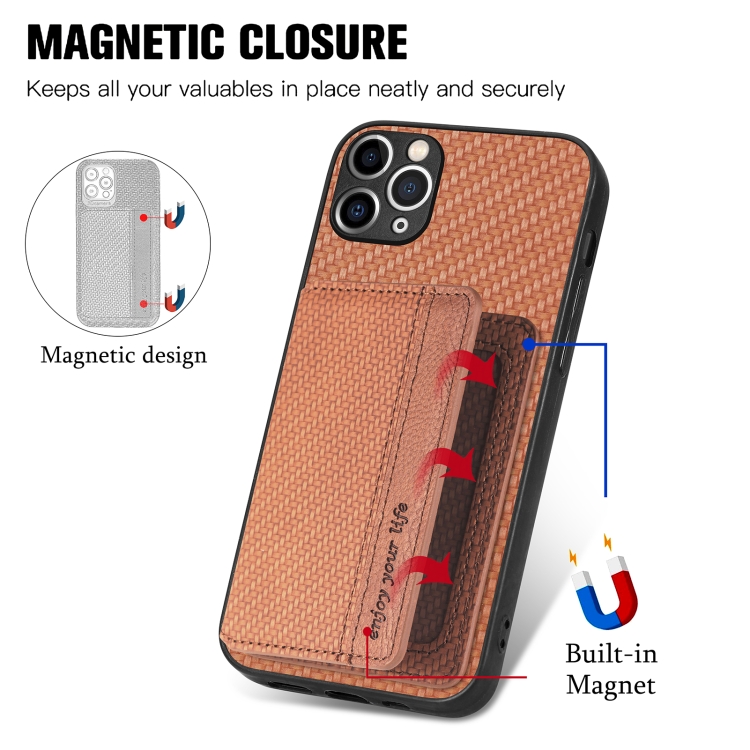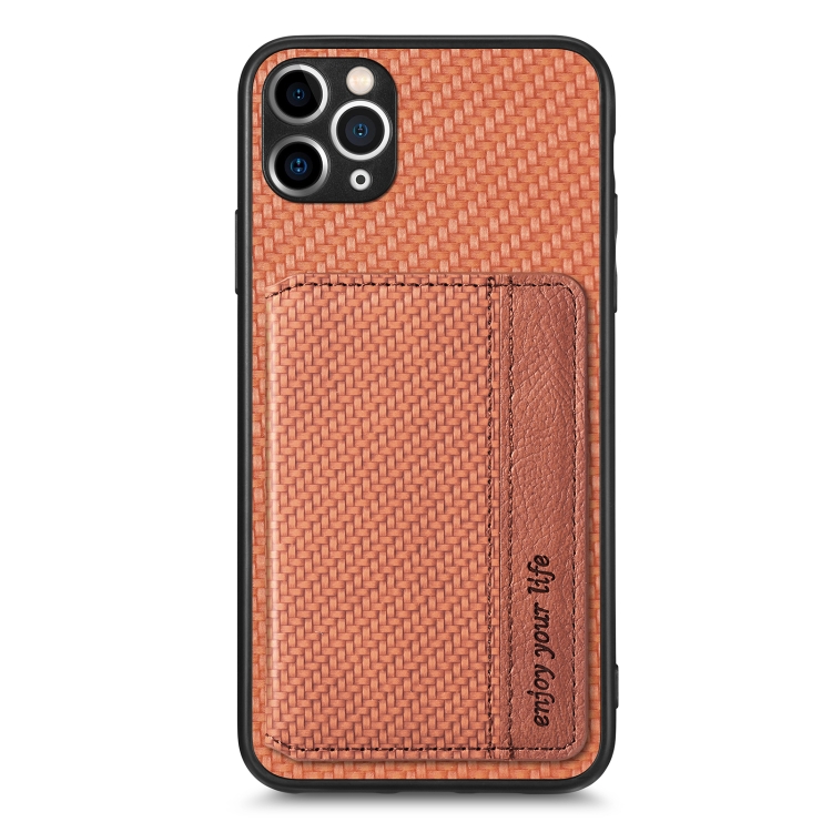 Caja de teléfono para iPhone 11 Pro con bolsa de tarjeta magnética de fibra de carbono (Marrón)