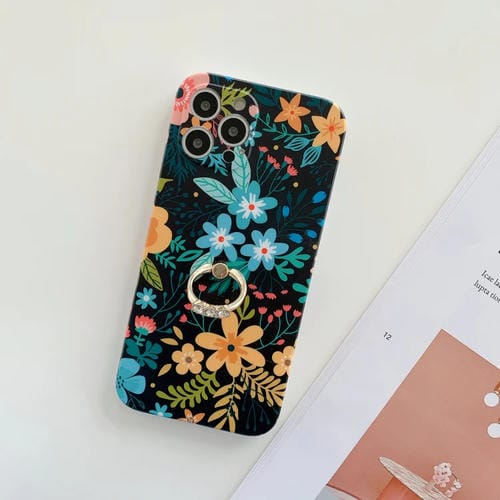 Funda TPU iPhone 11 Pro Frusted Flowers Pattel IMD con Anillo de Metal (Negro)