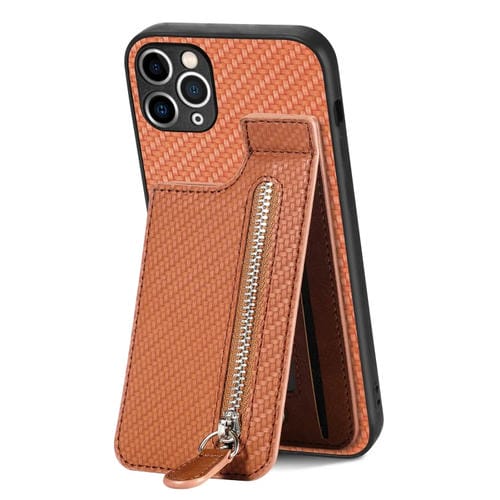 Funda de teléfono iPhone 11 Pro fibra de carbono con cremallera vertical (Marrón)