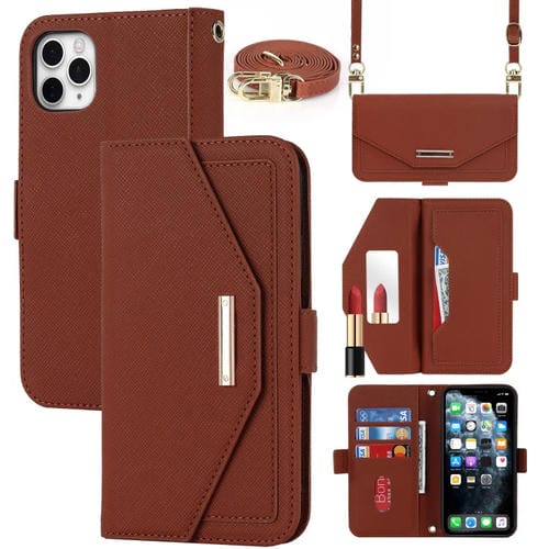 Funda para iPhone 11 Pro Max Cross Texture Lanyard de Cuero para Teléfono (Marrón)