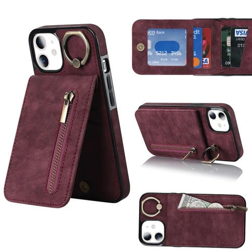 Estuche para Teléfono iPhone 11 Retro Ring And Zipper Ranura para Tarjeta Rfid (Rojo Vino)