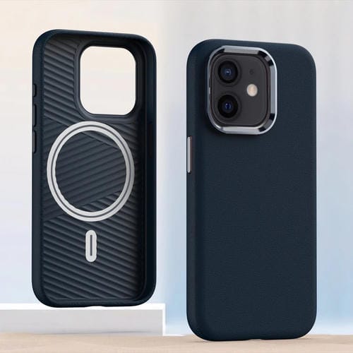 For iPhone 12 Magsafe Leather Phone Case with Metal Lens Frame Full Coverage Shockproof Case (Blue)