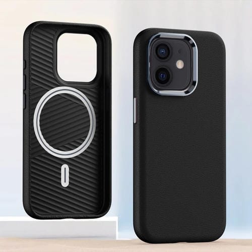 For iPhone 12 Leather Magsafe Phone Case with Metal Lens Frame Full Coverage Shockproof Case (Black)