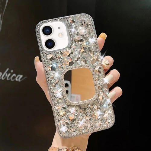 Funda para Teléfono iPhone 12 con Diamantes de Imitación Hecha a Mano con Espejo (Cuadrado Gris Plateado)