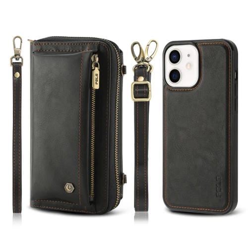 Funda para Teléfono iPhone 12 Cuero con Billetera y Cremallera Multifuncional Cruzada (Negro)
