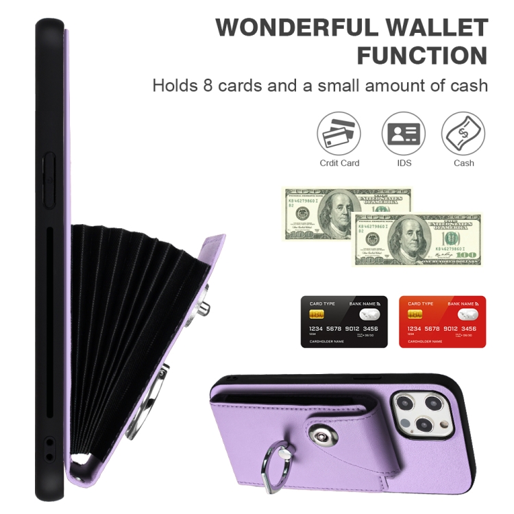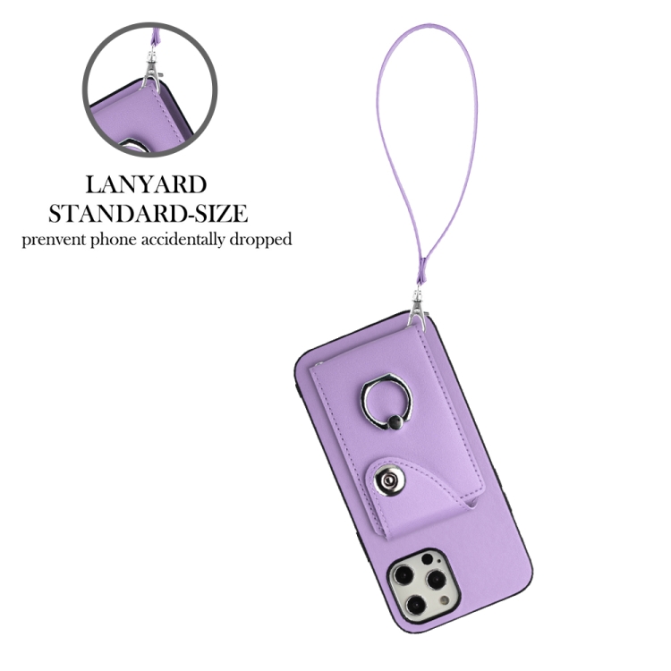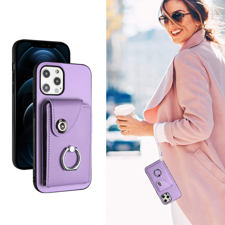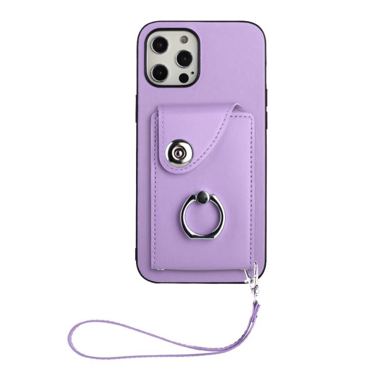 Funda para Teléfono iPhone 12 de PU con Soporte para Anillo y Bolsa para Tarjeta con Cordón (Púrpura)