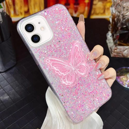 Funda para Teléfono TPU Epoxi iPhone 12 Mariposa Bordada Lentejuelas Estrelladas (Rosa)
