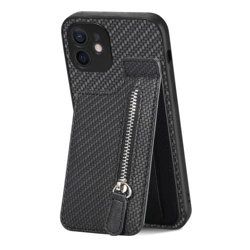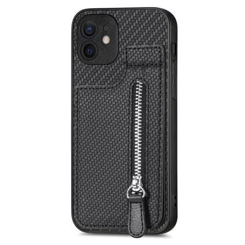 Caja de teléfono para iPhone 12 Mini con cremallera vertical de fibra de carbono (Negro)