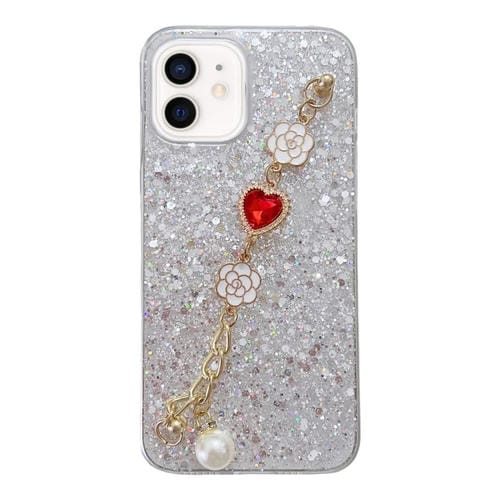 Funda para iPhone 12 Mini TPU Epoxi con Cadena Gemas de Amor Lentejuelas (Plateado)