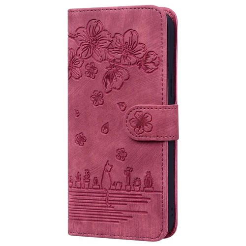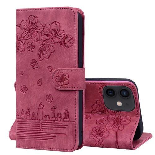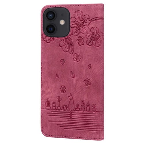 Estuche de Cuero iPhone 12 Mini Cartoon Sakura Cat En Relieve (Vino Rojo)