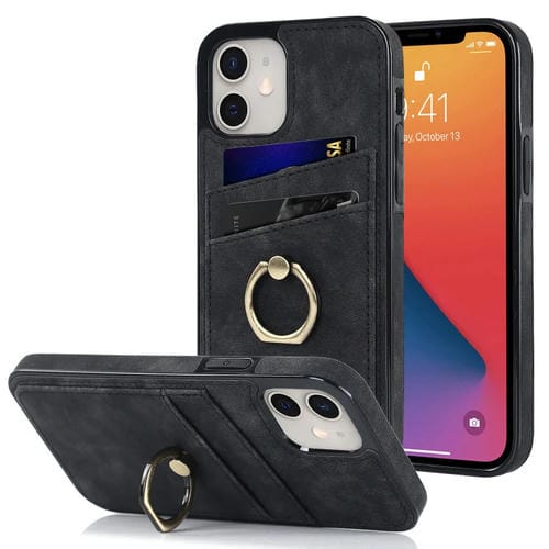 Funda para iPhone 12 Mini de Cuero con Parche Vintage y Soporte para Anillo (Negro)