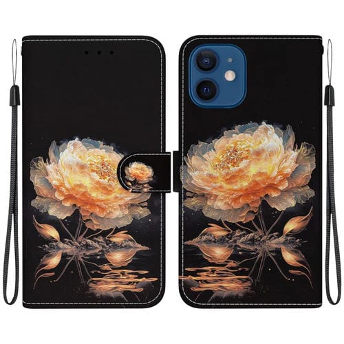 Funda de Cuero para Teléfono iPhone 12 Mini Dibujo Coloreado Textura de Cristal (Peonía Dorada)