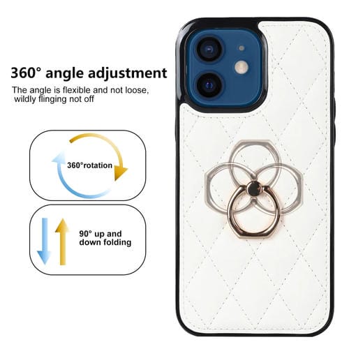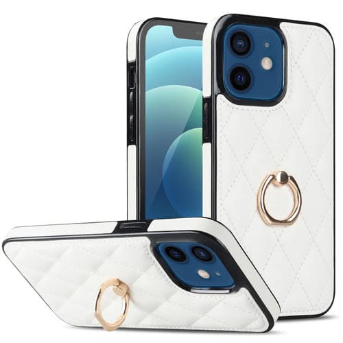 Funda para iPhone 12 Mini Rhombic PU Cuero con Soporte para Anillo (Blanco)
