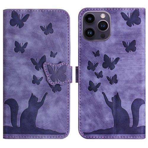 Funda de teléfono para iPhone 12 Pro Max Butterfly Cat de cuero con tapa en relieve (Púrpura)