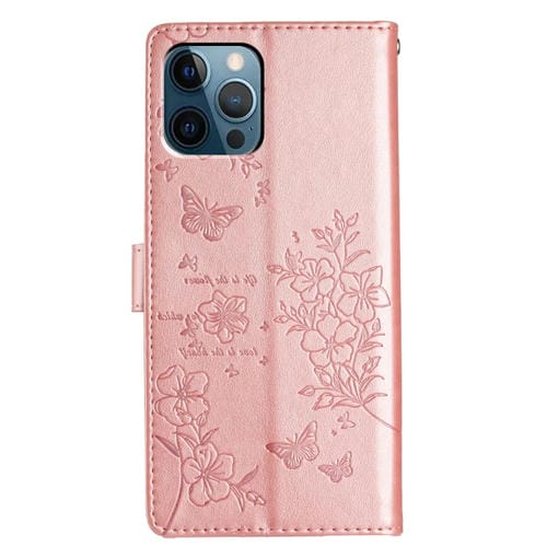 For iPhone 12 Pro Max Butterfly Love Flower Embossed Leather Phone Case(Rose Gold)