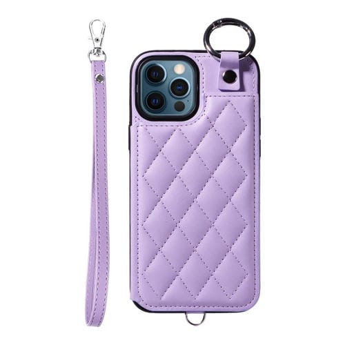 For iPhone 12 Pro Max Phone Case with Rhombic Texture Card Bag and Short Lanyard (Purple)