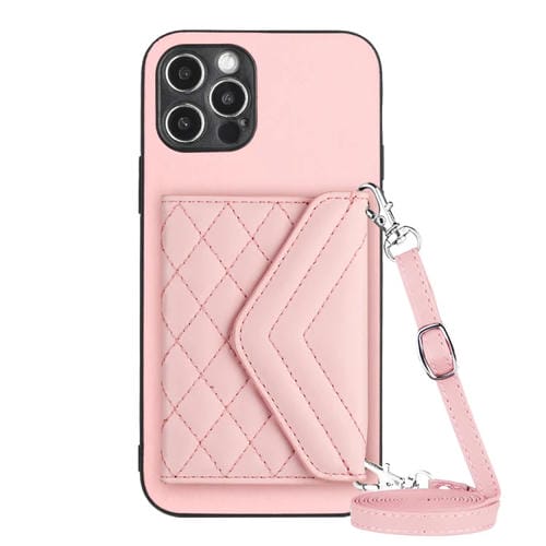 Estuche para Teléfono iPhone 12 Pro Max Rfid con Bolsa para Tarjetas Textura Rómbica Cordón Largo (Oro Rosa)