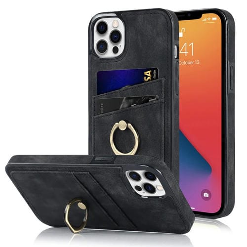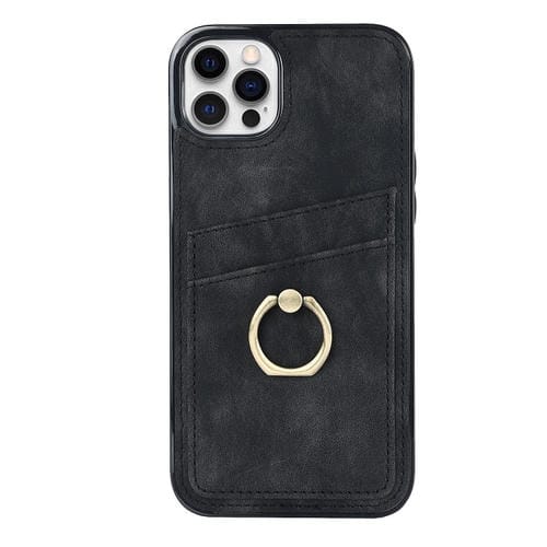 For iPhone 12 Pro Max Vintage Patch Leather Case with Ring Holder (Black)